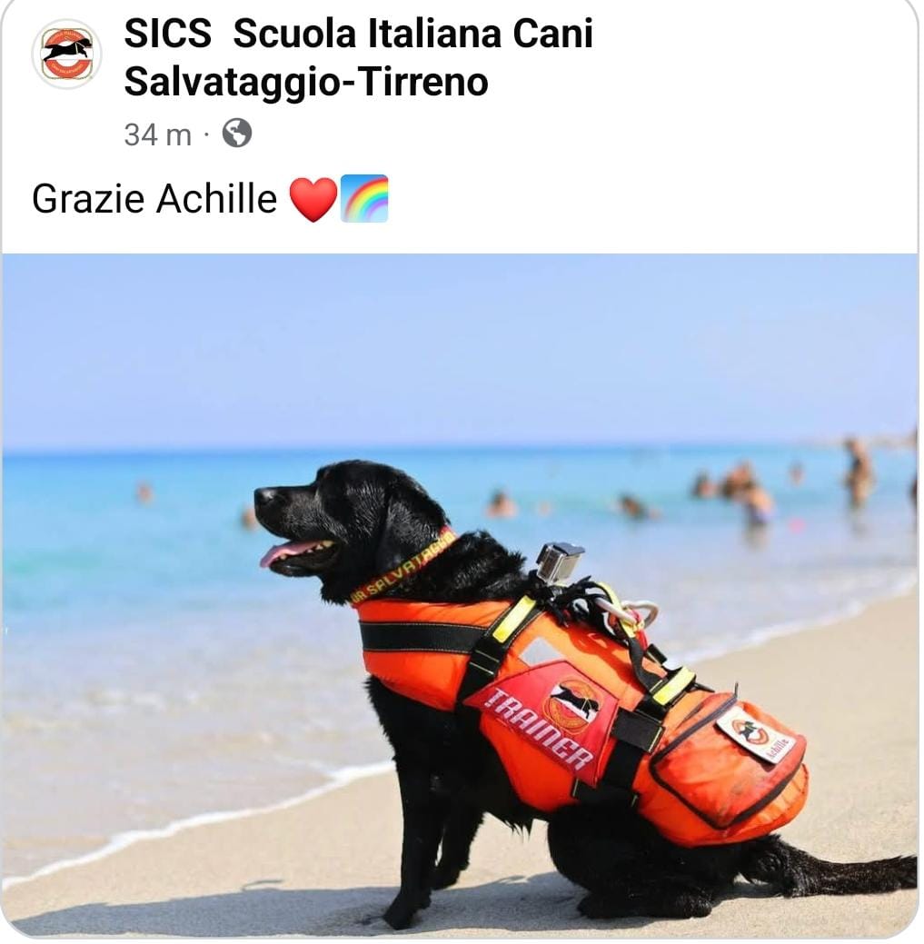 A darne notizia è lo stesso Egidio, suo fiero compagno di vita per 12 anni, che in una toccante lettera ha voluto ricordare il percorso di un cane speciale. Achille ha fatto parte per dieci anni della SICS – Scuola Italiana Cani Salvataggio, sezione Tirreno, partecipando a numerose attività di pattugliamento e a tanti interventi di soccorso in mare.