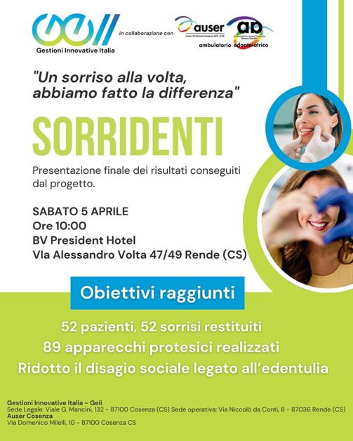 Dopo sei mesi di lavoro intenso, sinergie e impegno sul territorio, Gestioni Innovative Italia (Geii) e Auser Territoriale di Cosenza sono lieti di invitare la stampa alla conferenza stampa di chiusura del progetto sociale “Sorridenti”, che si terrà sabato 5 aprile alle ore 10:00 presso la Sala Pertini del BV President Hotel di Rende
