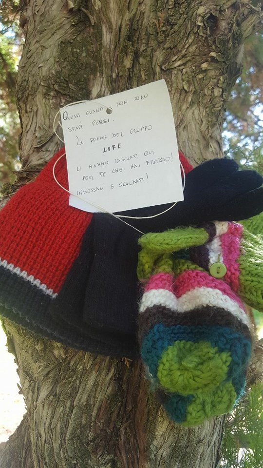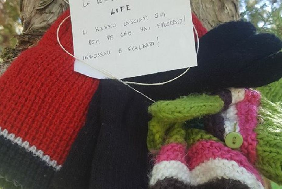 Si tratta di lasciare attaccate agli albero sciarpe e altri accessori invernali per chi meno fortunato sente freddo e ne ha bisogno. Si continuerà per tutto il fine settimana a lasciarne in giro per la città in posti in cui sono soliti sostare persone bisognose.