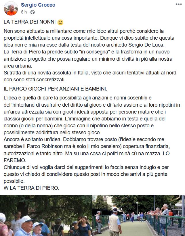 L’idea è quella di dare la possibilità agli anziani e nonni cosentini e dell’hinterland di usufruire del diritto al gioco e di farlo assieme ai loro nipotini in un’area attrezzata sia con giochi ideati apposta per persone mature che i classici giochi per bambini. L’immagine che abbiamo in testa è quella del nonno (o della nonna) che gioca con il nipotino nello stesso posto e possibilmente addirittura nello stesso gioco.