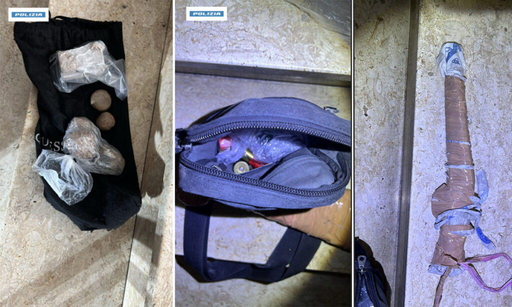 “In tale contesto operativo, in una nota via cittadina, personale della Squadra Mobile a seguito di segnalazione anonima, effettuava varie perquisizioni all’interno di un condominio con esito negativo mentre, sempre nel medesimo contesto, veniva ispezionato l’interno del vano ascensore dove sono stati rinvenuti due fucili, di cui uno a canne mozze, l’altro del tipo monocanna nonché nr. 20 cartucce cal. 12 , debitamente confezionati con nastro adesivo da imballaggio.”