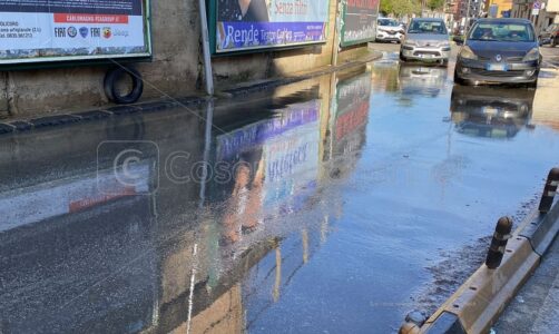 Una copiosa perdita di acqua ha allagato il tratto di strada di Via Pasquale Rossi a Cosenza
