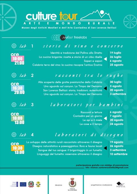 Culture tour: Arte e Mondo Rurale è un progetto finanziato a valere sul programma PAC Regione Calabria 2007/2013 – Scheda di intervento n. 7 Pilastro III Nuove operazioni – “Intervento per la promozione e la produzione culturale” promosso dalla Regione Calabria.