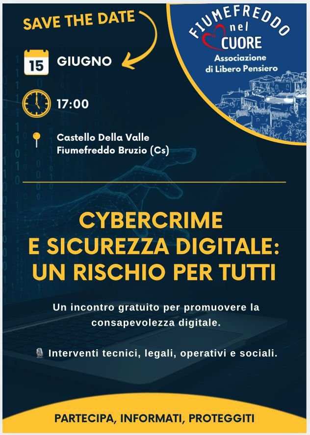 L’associazione culturale “Fiumefreddo nel Cuore”, impegnata nella promozione della cultura e della cittadinanza attiva, organizza l’evento pubblico “Cybercrime e sicurezza digitale: un rischio per tutti”, in programma domenica 15 giugno 2025 alle ore 17:00, presso il Castello Della Valle di Fiumefreddo Bruzio (CS)