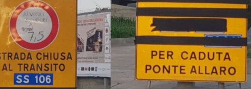 “Un cartello che va interpretato. Forse pure capito, nel senso di “compreso” e nell’accezione più lata di “giustificato”. Ma come la giri la giri, mettere su un viadotto un cartello di divieto d’accesso per “caduta ponte”, come ha fatto l’Anas sul cavalcavia che lungo la 106 passa sull’Allaro, ti strappa un sorriso amaro.”