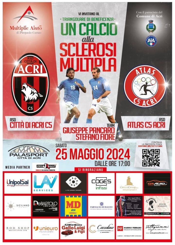 Si terrà infatti domani, 25 maggio, dalle ore 17, all’interno del palasport di Acri, il triangolare di beneficenza: “Un Calcio alla Sclerosi Multipla”, nel quale scenderanno in campo anche i campioni Giuseppe Pancaro, Stefano Fiore e Orlando Viteritti.