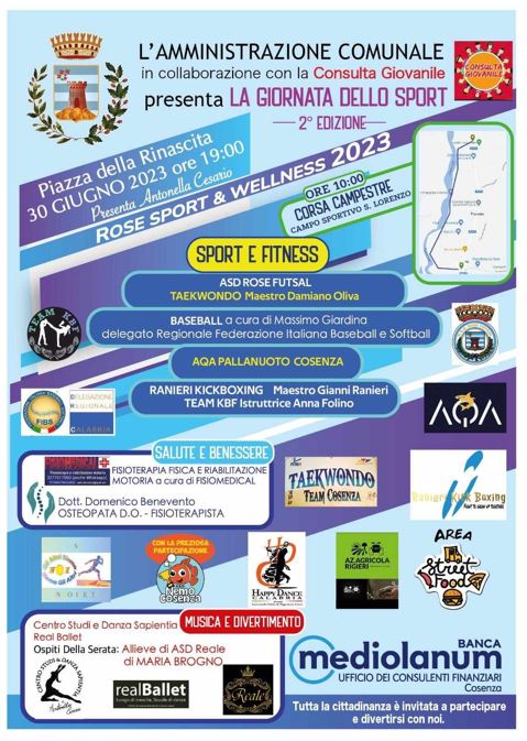 “Rose Sport & Wellness 2023 è il titolo della seconda edizione della “Giornata dello Sport”, prevista venerdì 30 giugno 2023 in piazza della rinascita in c/da Petraro a Rose, all’insegna dell’inclusione e della promozione sportiva.