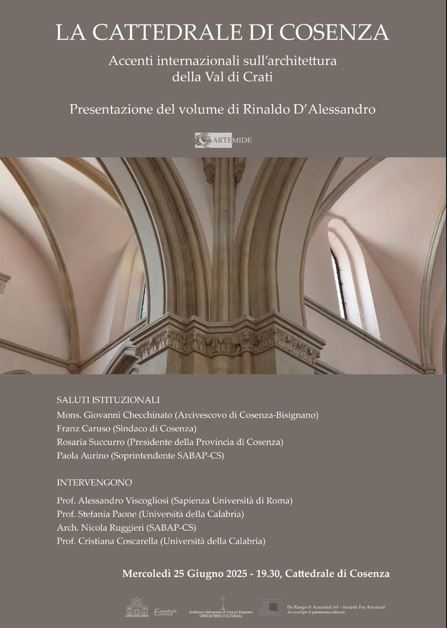 Mercoledì 25 Giugno alle ore 19.30 presso la Cattedrale di Cosenza si svolgerà la presentazione del volume “La Cattedrale di Cosenza. Accenti internazionali sull’Architettura della Val di Crati” di Rinaldo D’Alessandro”