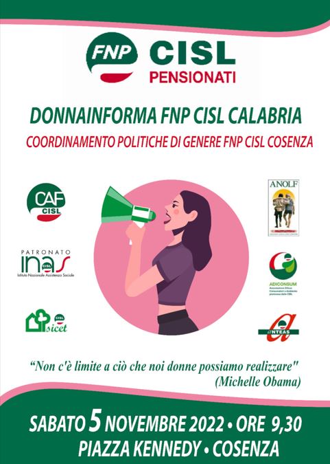 DonnaInforma è lo slogan dell’iniziativa che il Coordinamento politiche di genere della Federazione Nazionale Pensionati CISL della Calabria lancia su tutto il territorio regionale e che avrà come prima tappa Cosenza, sabato 5 novembre, in Piazza Kennedy, a partire dalle 9:30