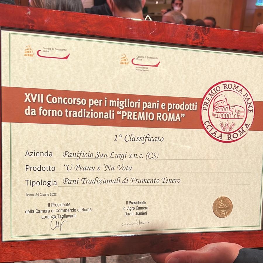 “Due panifici calabresi ottengono un prestigioso riconoscimento nel XVII concorso per i migliori pani e prodotti da forno tradizionali “Premio Roma”. Si tratta del Panificio San Luigi di Cosenza con “‘U peanu e ‘na vota” che ha trionfato al primo posto nell’ambito della sezione “Tipologia pani tradizionali di frumento tenero””