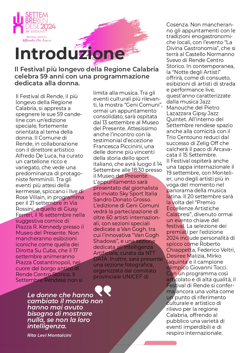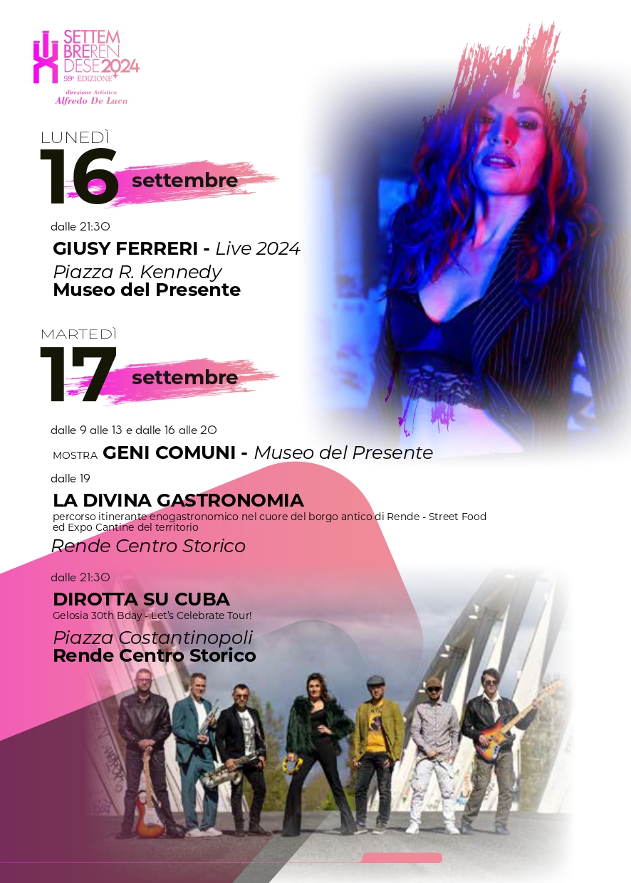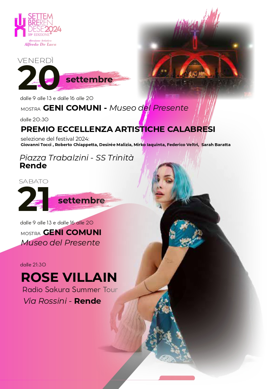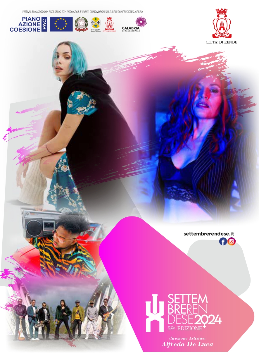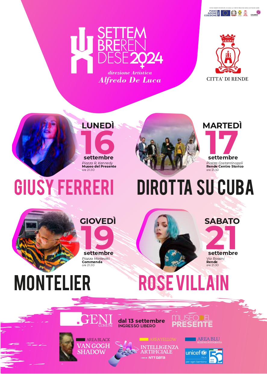 Il Comune di Rende, in collaborazione con il direttore artistico Alfredo De Luca, ha curato un cartellone ricco e variegato, che vede una predominanza di protagoniste femminili. Tra gli eventi più attesi della kermesse, spiccano i live di Rose Villain, in programma per il 21 settembre in Via Rossini, e quello di Giusy Ferreri, il 16 settembre nella suggestiva cornice di Piazza R. Kennedy presso il Museo del Presente.