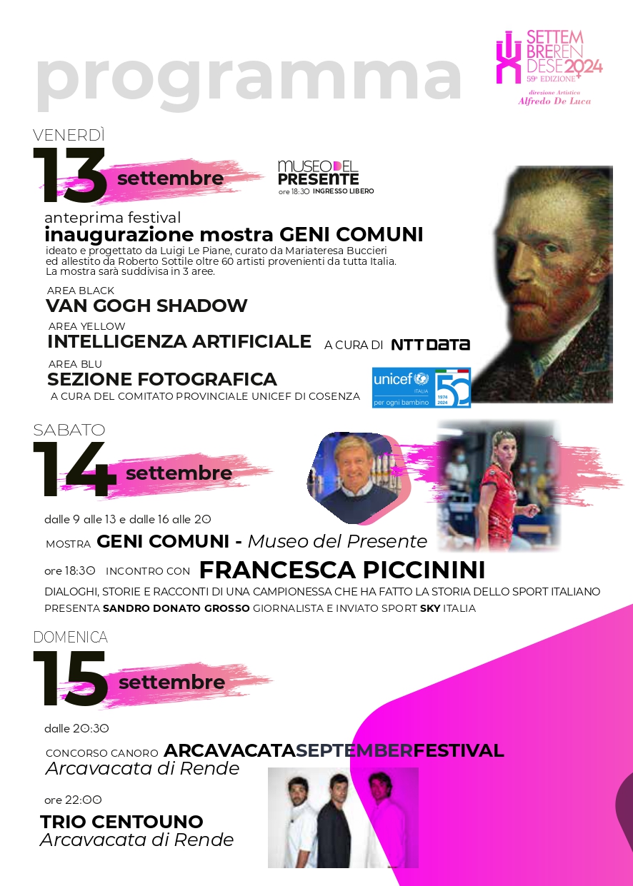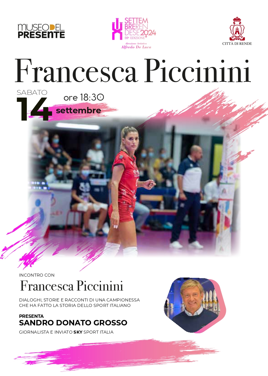 Il Settembre Rendese non si limita alla musica. Tra gli eventi culturali più rilevanti, la mostra “Geni Comuni”, ormai un appuntamento consolidato, sarà ospitata dal 13 settembre al Museo del Presente. Attesissimo anche l’incontro con la testimonial d’eccezione Francesca Piccinini, una delle donne più vincenti della storia dello sport italiano, che avrà luogo il 14 Settembre alle 18:30 presso il Museo del Presente. L’appuntamento sarà presentato dal giornalista ed inviato Sky Sport Italia Sandro Donato Grosso.
