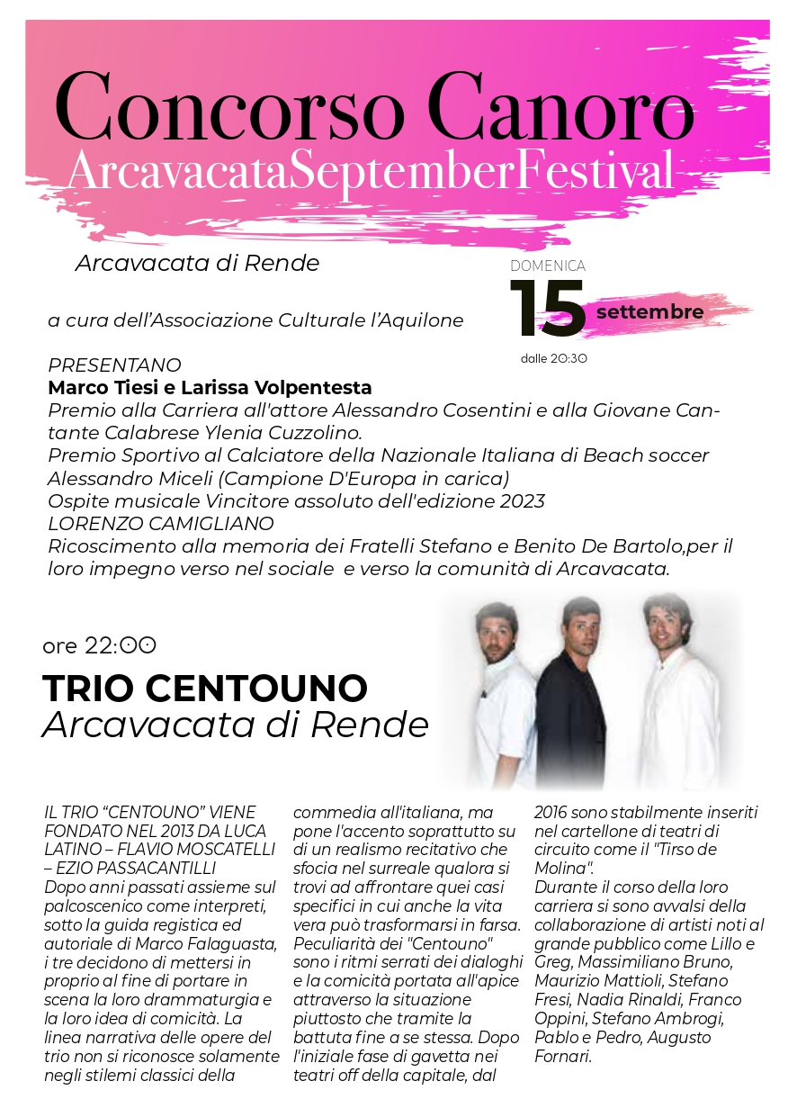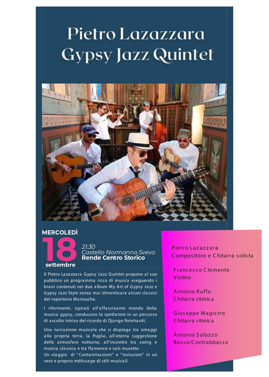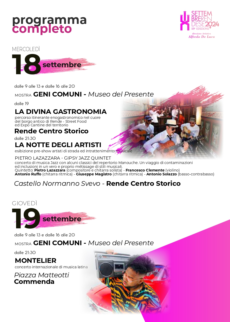 In contemporanea, la “Notte degli Artisti” offrirà, come di consueto, esibizioni di artisti di strada e performance live, quest’anno caratterizzate dalla musica Jazz Manouche del Pietro Lazazzara Gipsy Jazz Quintet. All’interno del Settembre rendese spazio anche alla comicità con il Trio Centouno reduci dal successo di Zelig Off che calcherà il paco di Arcavacata il 15 Settembre.