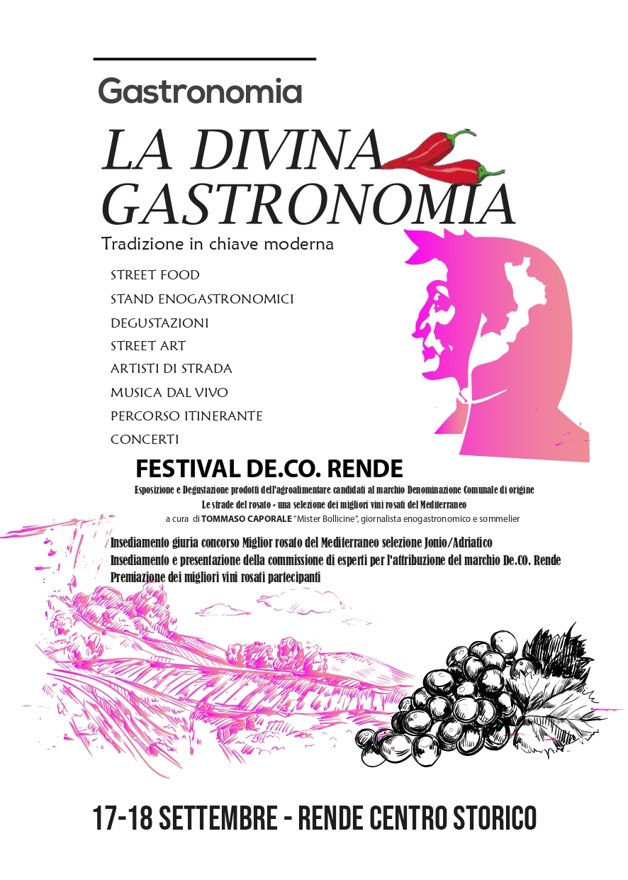 Non mancheranno gli appuntamenti con le tradizioni enogastronomiche locali, con l’evento “La Divina Gastronomia”, che si terrà al Castello Normanno Svevo di Rende Centro Storico.