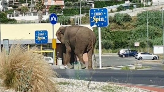 “Singolare episodio questa mattina per le strade di Amantea: un elefante, come documentato dalla foto, è scappato da un vicino circo, ha imboccato una rotonda dirigendosi verso un noto supermercato della cittadina tirrenica.”
