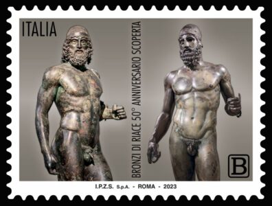 Nell’ambito delle celebrazioni del 50° anniversario del ritrovamento dei Bronzi di Riace, il Ministero delle Imprese e del Made in Italy ha emesso questo francobollo, su proposta del Museo Archeologico Nazionale di Reggio Calabria, per sottolineare la loro importanza artistica, storica e sociale nell’ottica della promozione dell’Italia e del suo magnifico patrimonio culturale.”