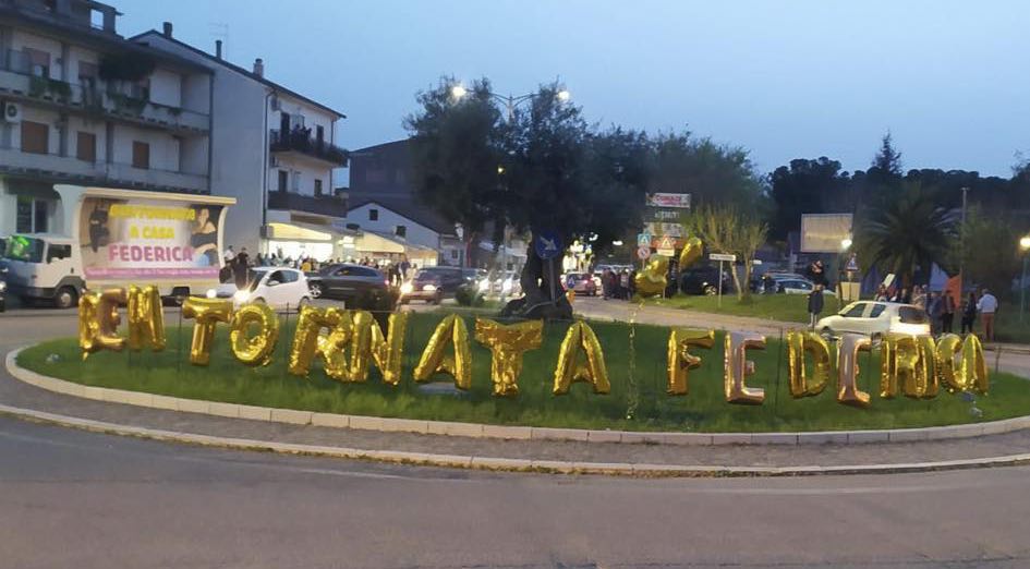 Tantissimi gli amici e parenti che hanno atteso Federica alla villetta di Taverna di Montalto Uffugo, con striscioni, palloncini, vele e fuochi d’artificio.