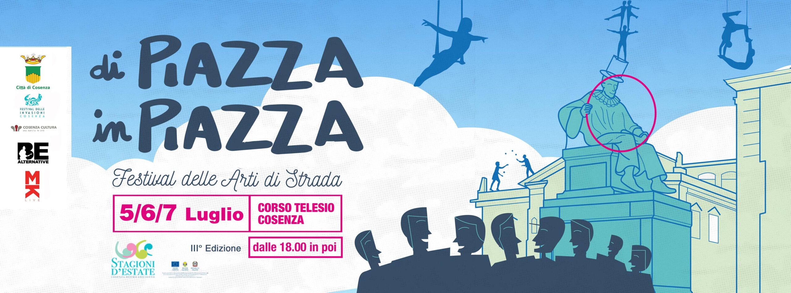 “Tre giornate nel centro storico di Cosenza, dal 5 al 7 luglio, tra passeggiate nei vicoli, acrobazie aeree, equilibrismo, spettacoli col fuoco, giocoleria, mimo, clowneria, animazione itinerante, trampoleria, statue viventi, musicisti di strada e molto altro ancora. Attività e spettacoli totalmente gratuiti, per coinvolgere grandi e piccini. Di piazza in piazza si muoveranno gli artisti nazionali ed internazionali e daranno vita ad uno spettacolo itinerante di arte e magia.