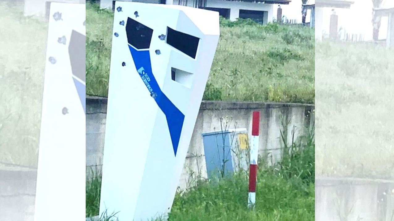Sul dispositivo per il controllo della velocità collocato lungo la statale 18 sono evidenti decine di fori di proiettile