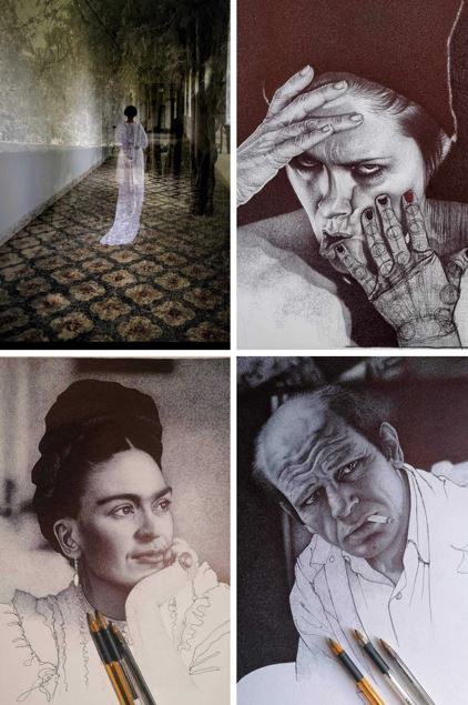 Il percorso passa attraverso il lungo periodo di alienazione, follia e solitudine durante la pandemia che ha messo in ginocchio l’intero globo e poi verso il bisogno sempre più profondo di essere nella sua terra, dopo la perdita del padre, operando sul territorio cosentino, distaccandosi da sé stessa e dalla propria figura, per dedicarsi a ritratti accuratissimi e maniacali sempre interamente eseguiti a penna bic, di grandi e geniali artisti del ‘900.