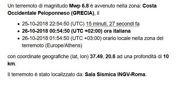 “Il 26 Ottobre 2018 ore 00:54 è stata registrata una scossa di terremoto di magnitudo 6.8 e profondità 10 km a Kerion (Grecia).