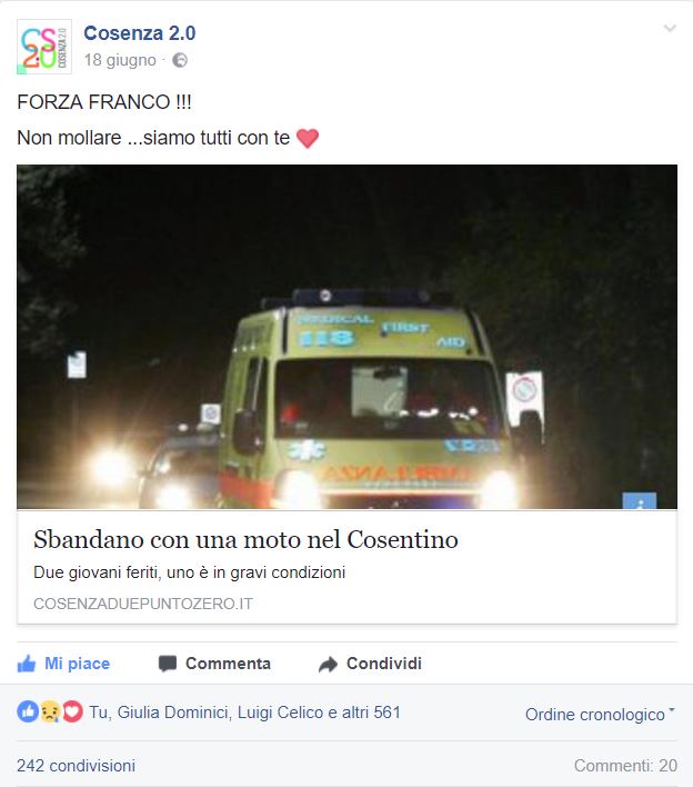“Sono Franco, il ragazzo che ha fatto l’incidente in moto in località Salice (Torano Castello) circa 2 mesi fa.