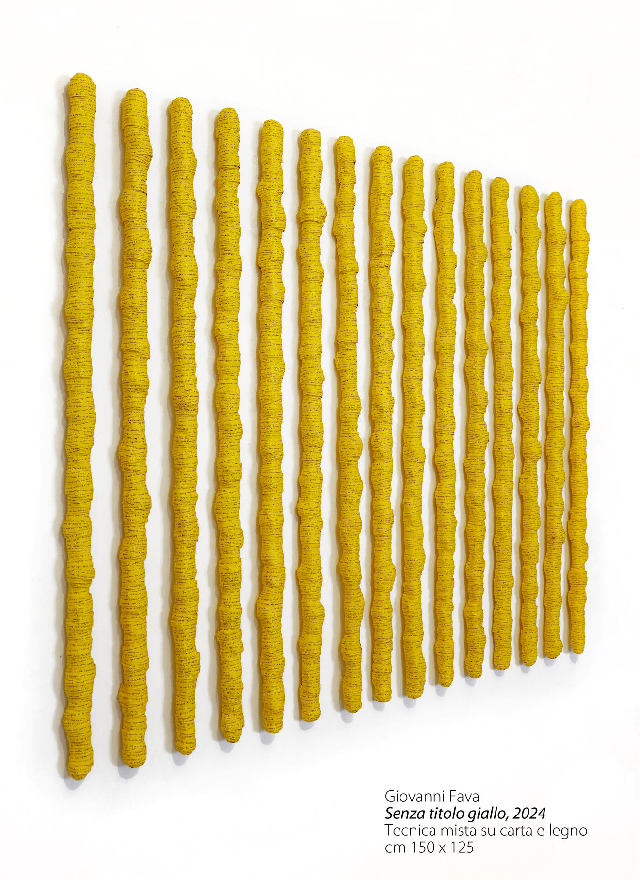 Altrettanto significativa l’installazione “Senza titolo giallo”, tecnica mista su carta e legno: composta da 15 elementi avvolti da scritte su carta in forma spiraliforme, l’opera crea un ritmo visivo fatto di pieni e vuoti, un moto circolare che ipnotizza e coinvolge. Lo spettatore viene assorbito da un turbinio di idee e pensieri, come dentro una corrente inarrestabile, dove inizio e fine si fondono in una tensione continua.