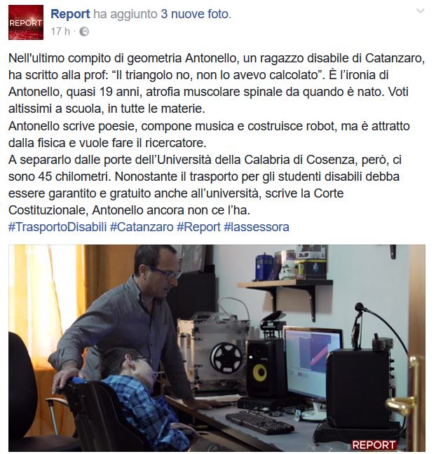 “Report ritorna sul caso dei disabili lasciati a piedi dalla Regione Calabria con un post su Facebook. Racconta la storia di Antonello – il ragazzo da cui era partita l’inchiesta sgradita all’assessore Federica Roccisano – che «ha scritto alla prof: “Il triangolo no, non lo avevo calcolato”». Antonello, che ha quasi 19 anni, è affetto da atrofia muscolare spinale da quando è nato. Conserva l’ironia e ha voti altissimi a scuola, in tutte le materie. E poi scrive poesie, compone musica e costruisce robot, ma è attratto dalla fisica e vuole fare il ricercatore.”