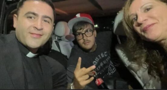 Facciamo le foto, le auto in uscita allo svincolo, intanto che gli uomini della Digos si stanno spostando per scortarci, si fermano… “Ma è Geolier!” dice qualcuno, dando di clacson…Noi intanto non crediamo alle nostre orecchie, Geolier è sorpreso di aver incontrato questo parroco così travolgente: “Grazie, grazie a voi! Auguri per tutto” dice Emanuele, stringendo le mani di Don Mario e della catechista, come si fa con amici di vecchia data; le dita della mano sinistra in segno di vittoria, l’altra, dopo i saluti, sul cuore. Strette di mano e sorrisi, si chiude il Van e Geolier sparisce nel traffico dei suoi fan.