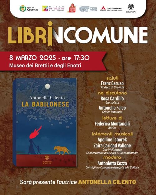 Alle ore 17,30 in programma la presentazione, al Museo dei Brettii e degli Enotri, del libro di Antonella Cilento “La Babilonese”, edito da Bompiani. Un romanzo che, attraverso una scrittura intensa e raffinata, racconta la forza delle passioni e la complessità delle relazioni umane. L’incontro con l’autrice offrirà l’occasione di approfondire temi come la memoria, il desiderio e il potere evocativo della parola.