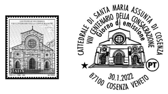 “In occasione dell’ottavo centenario della Consacrazione della Cattedrale di Cosenza, Poste Italiane comunica che oggi viene emesso dal Ministero dello Sviluppo Economico un francobollo celebrativo, relativo al valore della tariffa B pari a 1,10€. Ogni foglio contiene ventotto esemplari.”