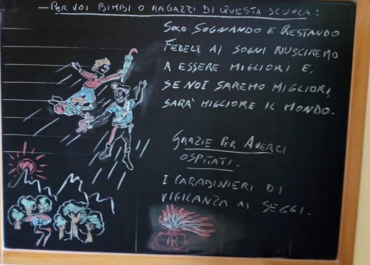 “Primo giorno di scuola con dedica a sorpresa. Un messaggio lasciato sulla lavagna. Gli auguri dai carabinieri in servizio ai seggi elettorali nel plesso della scuola primaria Duglia dell’IC Padula di Acri, nell’edificio Vaglica.”