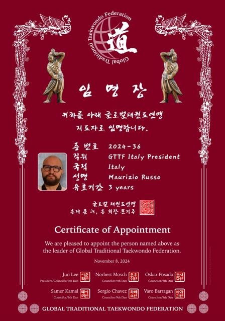La sua esperienza e la sua passione per il Taekwondo non sono passate inosservate nemmeno agli occhi dei coreani della Global Federation di Taekwondo tradizionale.