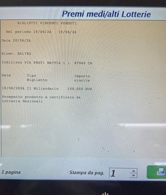 É stata realizzata ieri, 19 giugno 2024, una vincita da 100mila euro al “Gratta e Vinci” a Castrolibero. Il fortunato giocatore ha acquistato il tagliando, un biglietto da €5 del gioco “Il Miliardario”, presso il bar tabacchi “The Daily Bar di Bruni Andrea”, situato in via Mattia Preti 5/7.