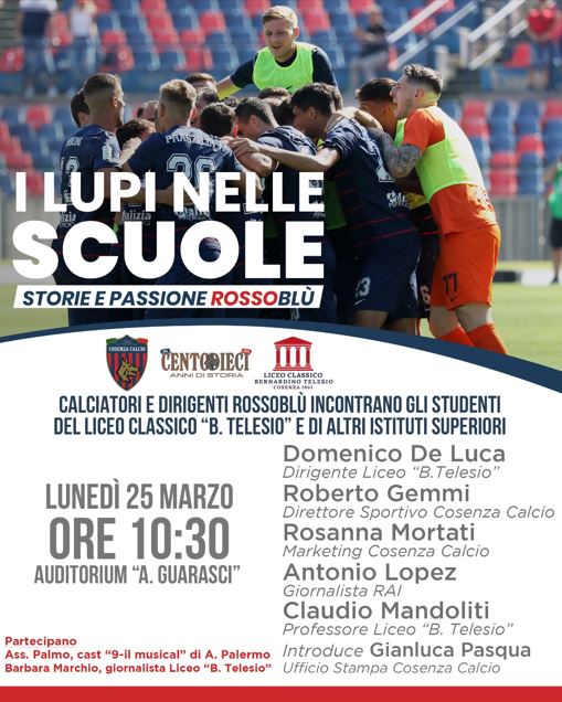 “La Società Cosenza Calcio, nell’ambito della iniziativa “I Lupi nelle scuole. 110 anni di storia e passione”, propone un incontro tra una delegazione composta da dirigenti e calciatori del Club rossoblù, gli studenti del Liceo Classico B. Telesio ed altri istituti invitati.