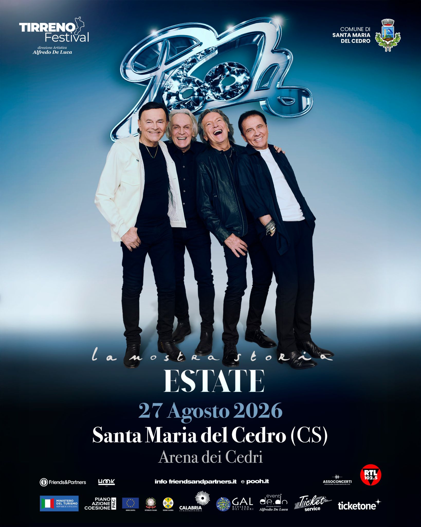 La tappa calabrese si terrà il 27 agosto 2026 presso il nuovo auditorium di Santa Maria del Cedro, dove la band proporrà il live “POOH 60 – La nostra storia – Estate”, inserito nel ricco calendario del Tirreno Festival. Qui i fan potranno vivere l’emozione di un concerto dedicato ai sessant’anni di successi, tra grandi classici e momenti indimenticabili, in una cornice suggestiva affacciata sul mare.