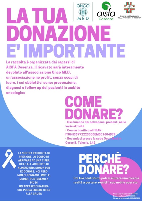 L’AISFA-Cosenza  (Associazione Italiana Studenti di Farmacia), associazione apartitica, apolitica e senza scopo di lucro, sta organizzando una raccolta fondi che si terrà dal 1 Dicembre al 10 Gennaio in favore di Onco Med, associazione attiva nello screening, nella diagnosi e nel follow-up del paziente oncologico
