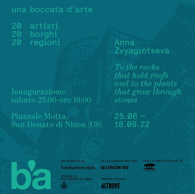 Dal 25 giugno al 18 settembre 2022 il borgo di San Donato di Ninea (CS) in Calabria ospiterà un intervento d’arte contemporanea di Anna Zvyagintseva per la terza edizione di Una Boccata d’Arte 20 artisti 20 borghi 20 regioni