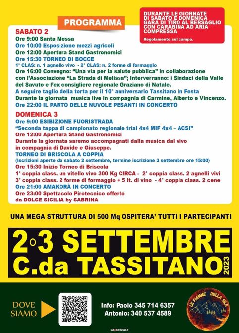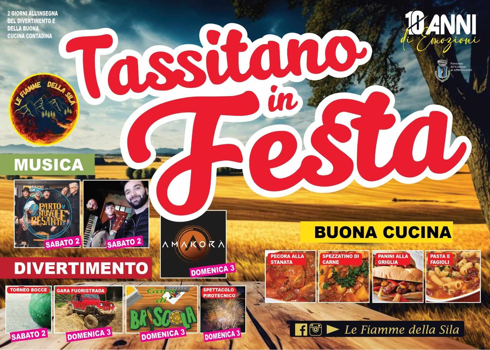 Dieci anni fa, a Tassitano, piccola frazione di Aprigliano, nel cuore della Sila, si realizzava il sogno di un gruppo di giovani. L’amore per la tradizione, la passione e il rispetto per la propria terra infuocavano gli animi di questa gente. Le Fiamme della Sila, da 10 anni, dedicano anima e cuore per regalarvi Tassitano in Festa!