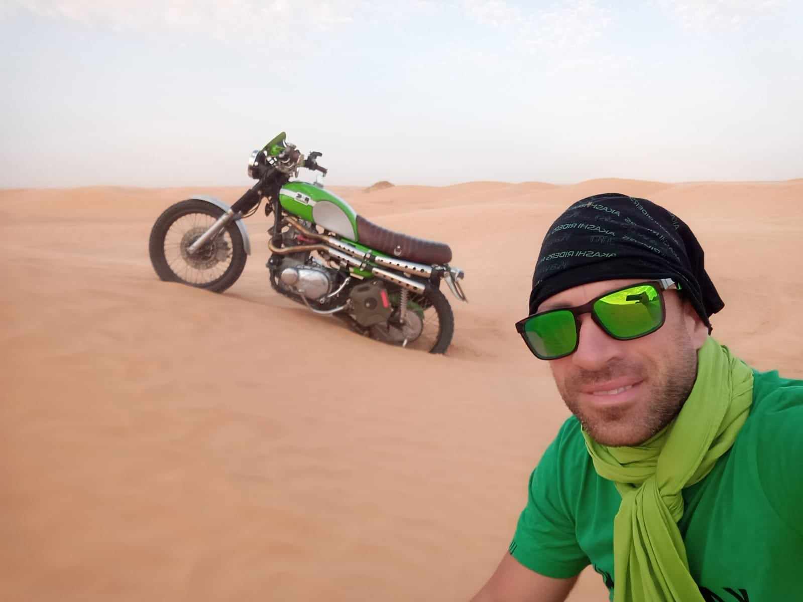 Ma Andrea questa volta non ha voluto farsi accompagnare dalla sua solita Harley, bensì ha effettuato l’attraversata in sella ad una Kawasaki del 1975, da lui restaurata e scramblerizzata.