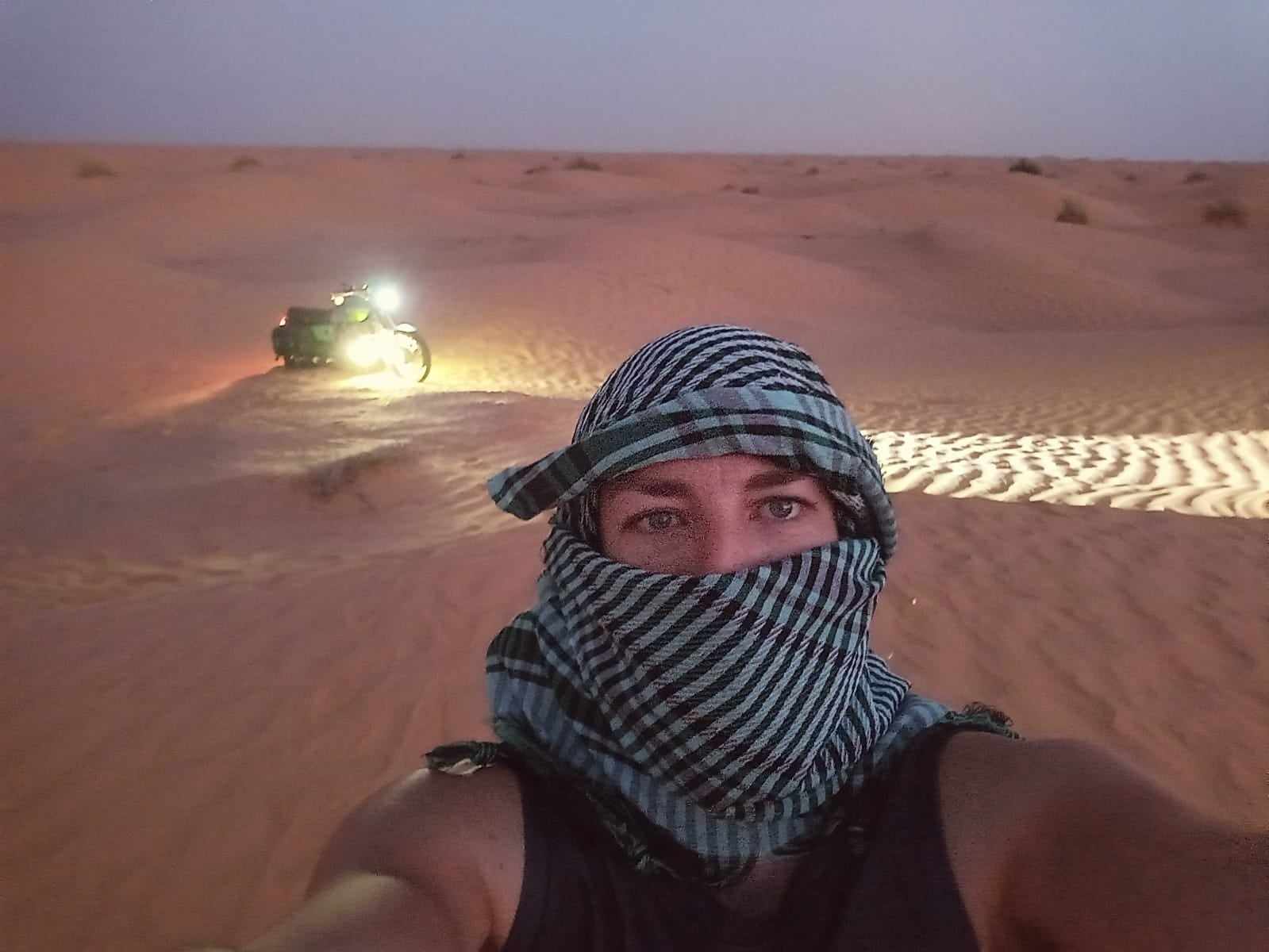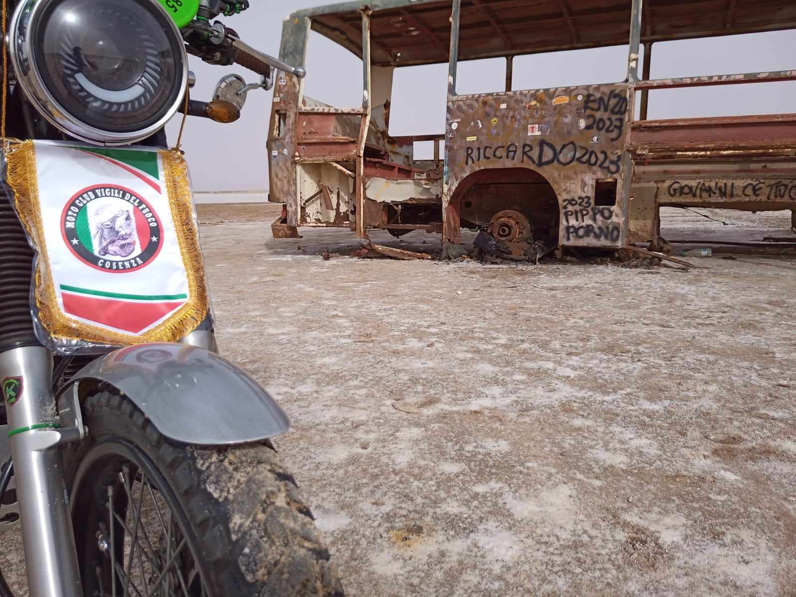 I due hanno dormito una notte nel grande lago salato, oramai prosciugato, e 3 notti in un’oasi a sud della Tunisia, nel cuore del Sahara. Qui hanno raggiunto il bus abbandonato nel mezzo del grande lago salato, meta simbolica per tutti i veri appassionati di Off-Road, dove hanno attaccato anche gli adesivi dei Motoclub che li supportano da Cosenza, ovvero Kawalieri Cs, MCR Calabria Riders ed il Motoclub dei vigili del fuoco, sezione Cosenza.