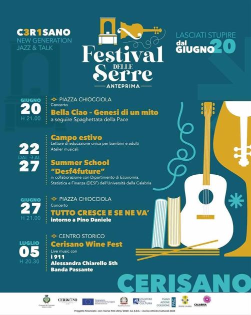 In quest’ottica, il Festival delle Serre si inserisce all’interno del più ampio progetto Cerisano Factory – Borgo swing, sostenuto dal Ministero della Cultura nell’ambito del PNRR, Missione 1 Misura 2 Intervento 2.1: “Attrattività dei borghi storici”, finanziato dall’Unione europea – Next Generation EU.