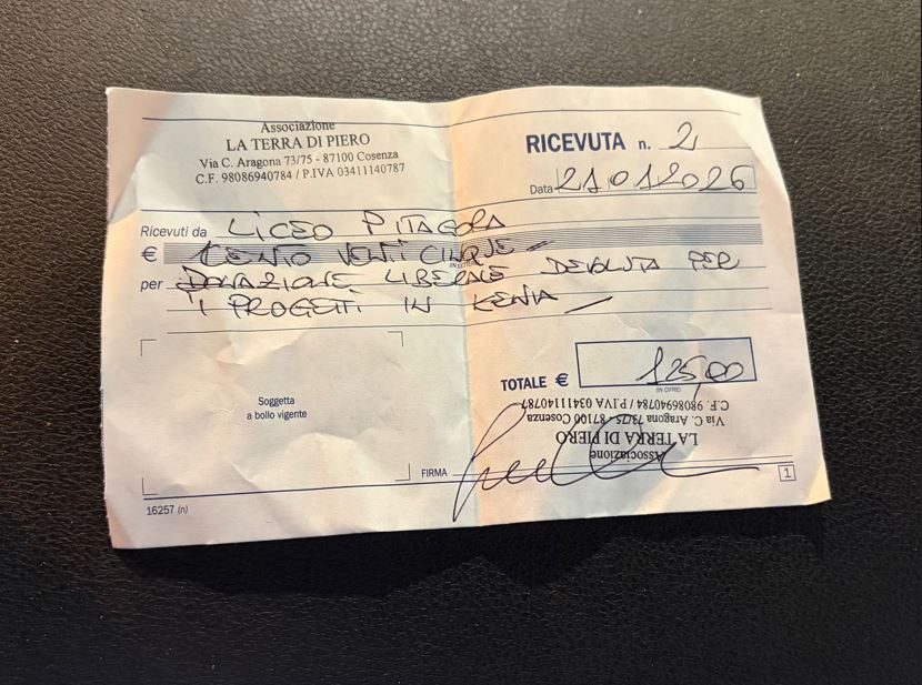 La consegna è avvenuta ieri sera nella sede della Terra di Piero, portata in rappresentenza del Pitagora da Ruffolo e Foglietti, e oggi la donazione è già in viaggio per il Kenya.