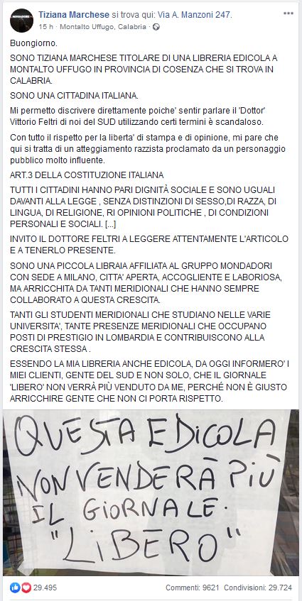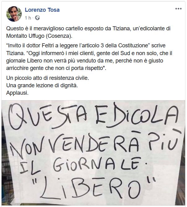 Il post della edicolante di Montalto Uffugo, con esplicito riferimento alle parole di Vittorio Feltri, sta riscontrando un successo enorme sul web. Tanto che anche il giornalista Lorenzo Tosa lo ha appena ripostato sulla sua seguitissima pagina Facebook.