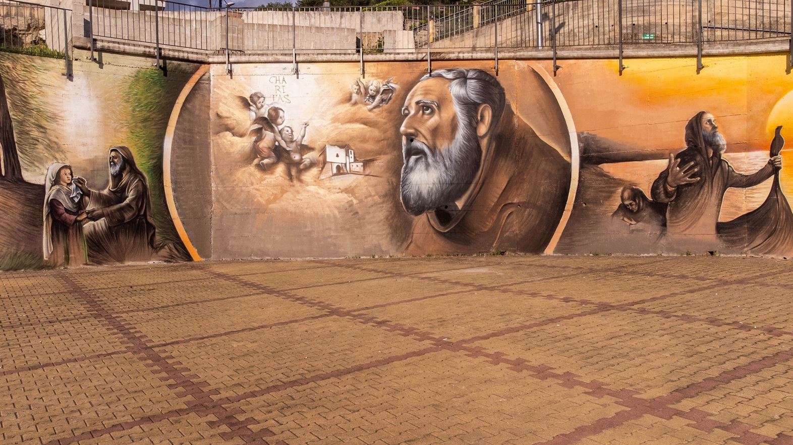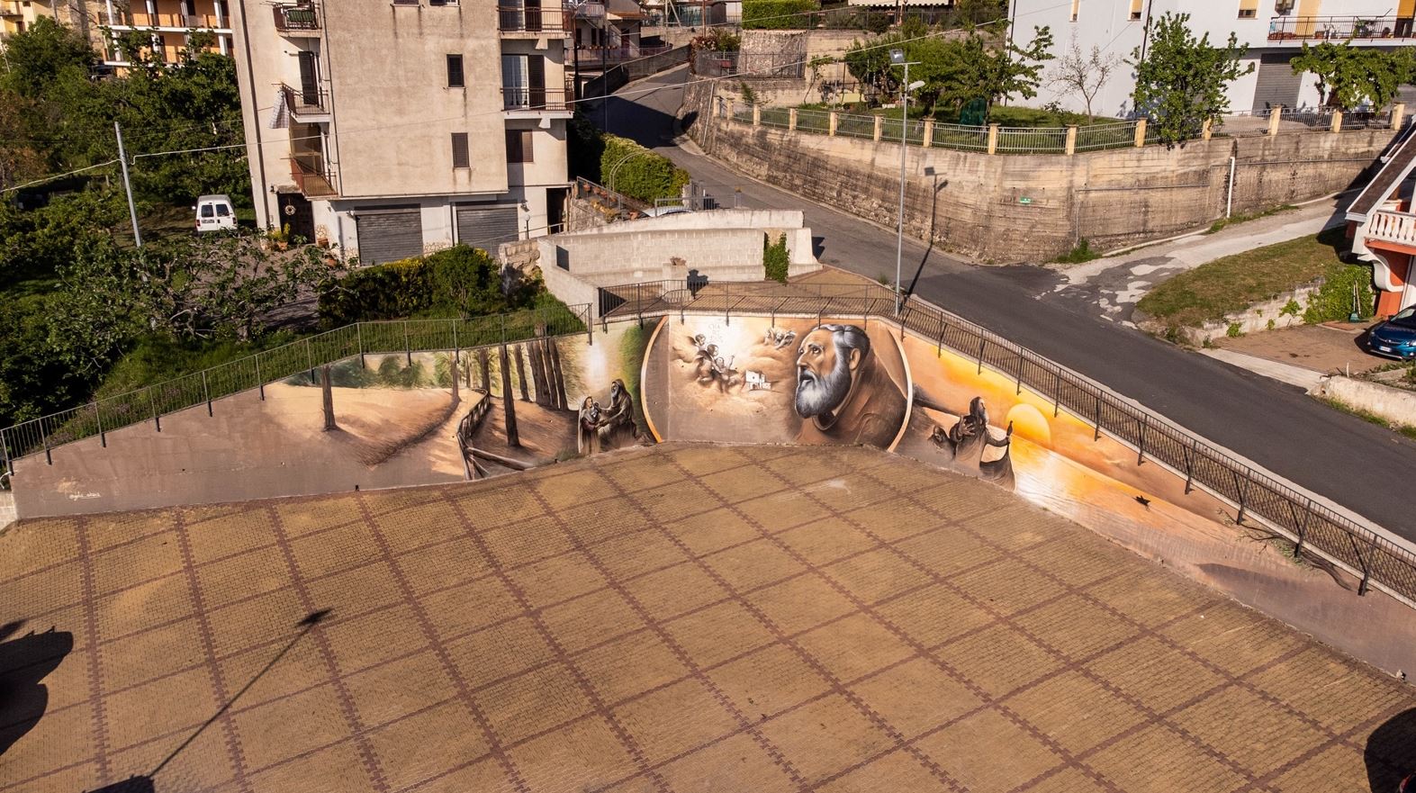 L’artista Claudio Morne ha realizzato una grande opera nei pressi del Santuario di San Francesco di Paola a Spezzano della Sila, dando voce alla devozione dei credenti e all’importanza che il Santo e il santuario hanno per tutta la comunità spezzanese. Su oltre 150mq di superficie l’artista ha voluto rappresentare in tre scene l’apparizione dell’arcangelo Michele al Santo, il miracolo dell’attraversamento dello stretto di Messina e l’incontro con la giovane vittima di soprusi lungo un sentiero di montagna, proprio a voler sottolineare l’umanità e la santità di Francesco di Paola.