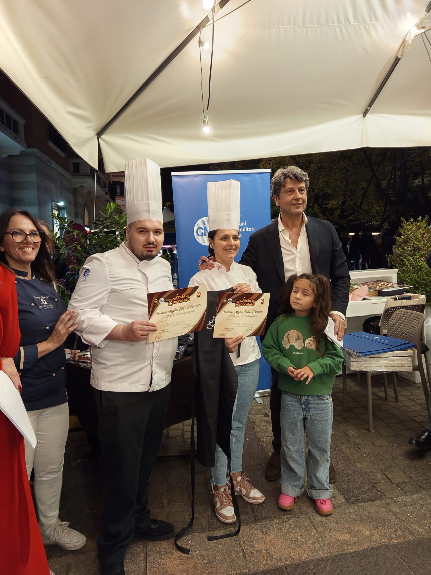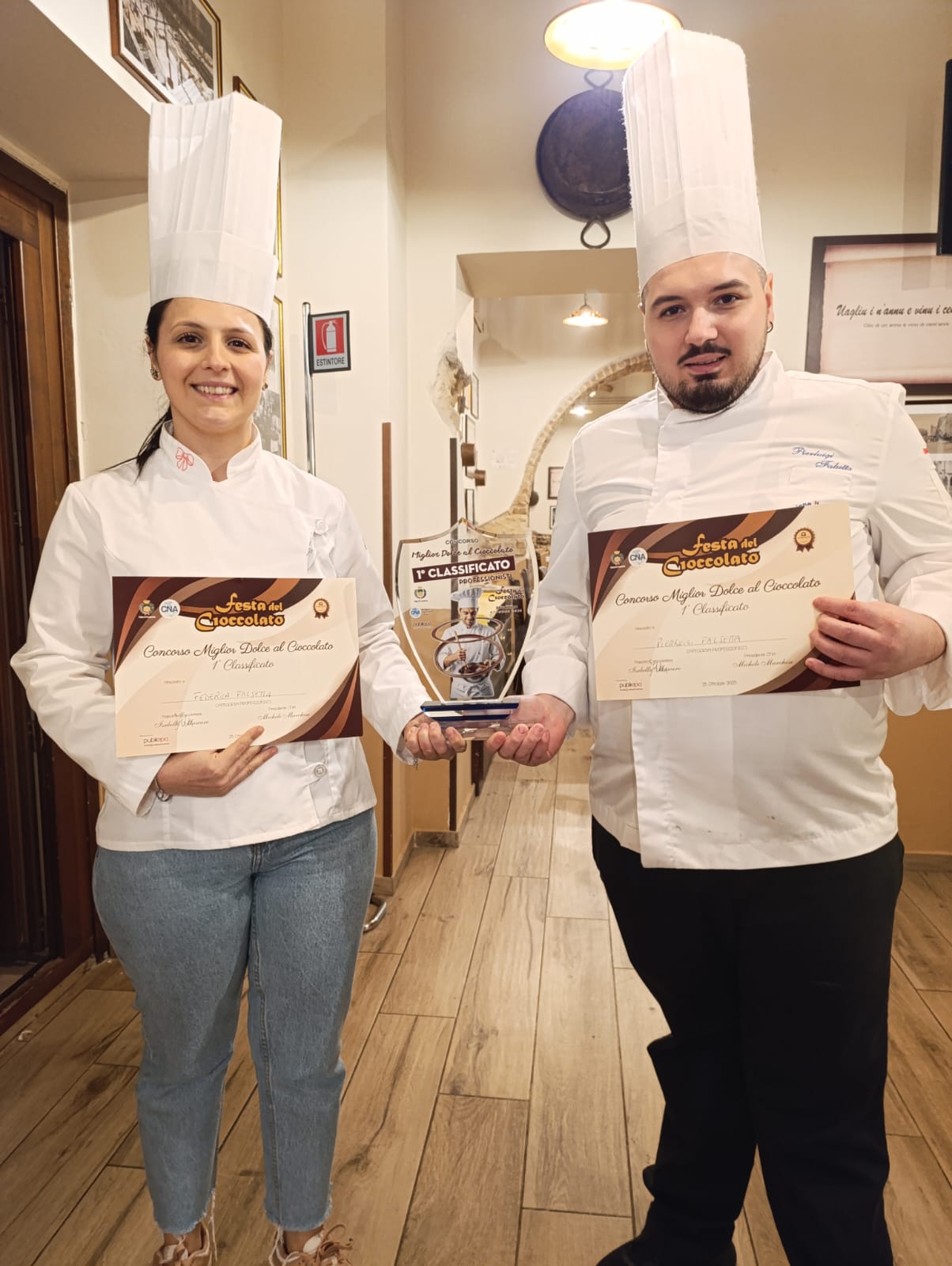 A trionfare nella loro categoria sono stati i due giovani fratelli Falsetta, Federica e Pierluigi, con il loro “Rochèr Prezioso”; una sfera di semifreddo al Nerone puro, con cuore alla nocciola, glassa specchio al cioccolato al latte, mulinello goloso e stalattite di nocciola caramello.
