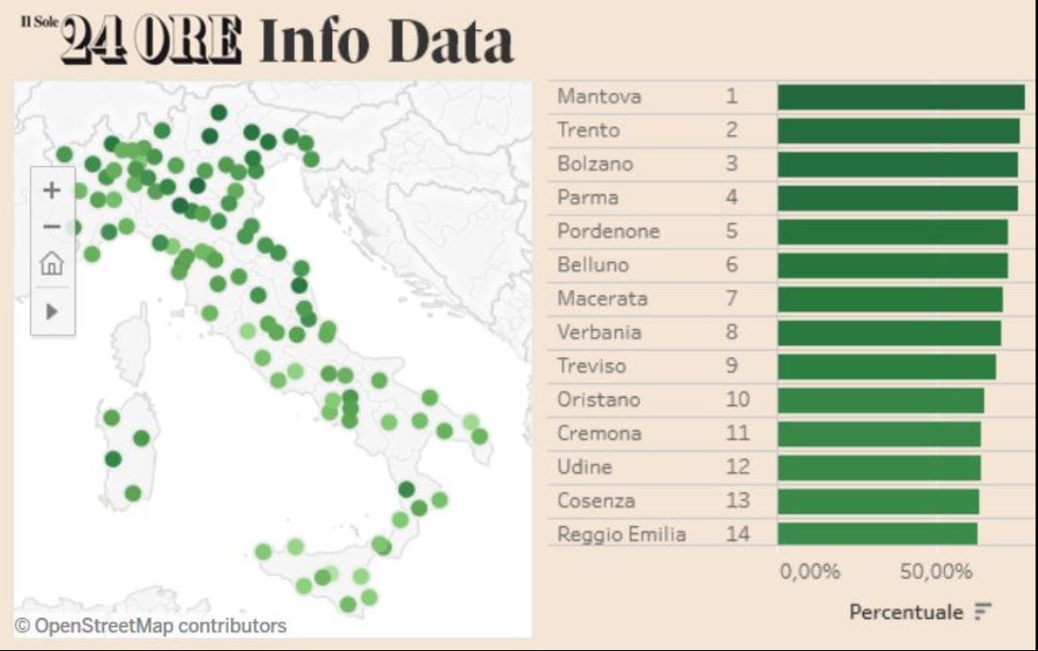 Cosenza al 13′ posto, nella parte più alta della graduatoria contenente tutti i capoluoghi italiani; quella con il verde più intenso della sostenibilità.
