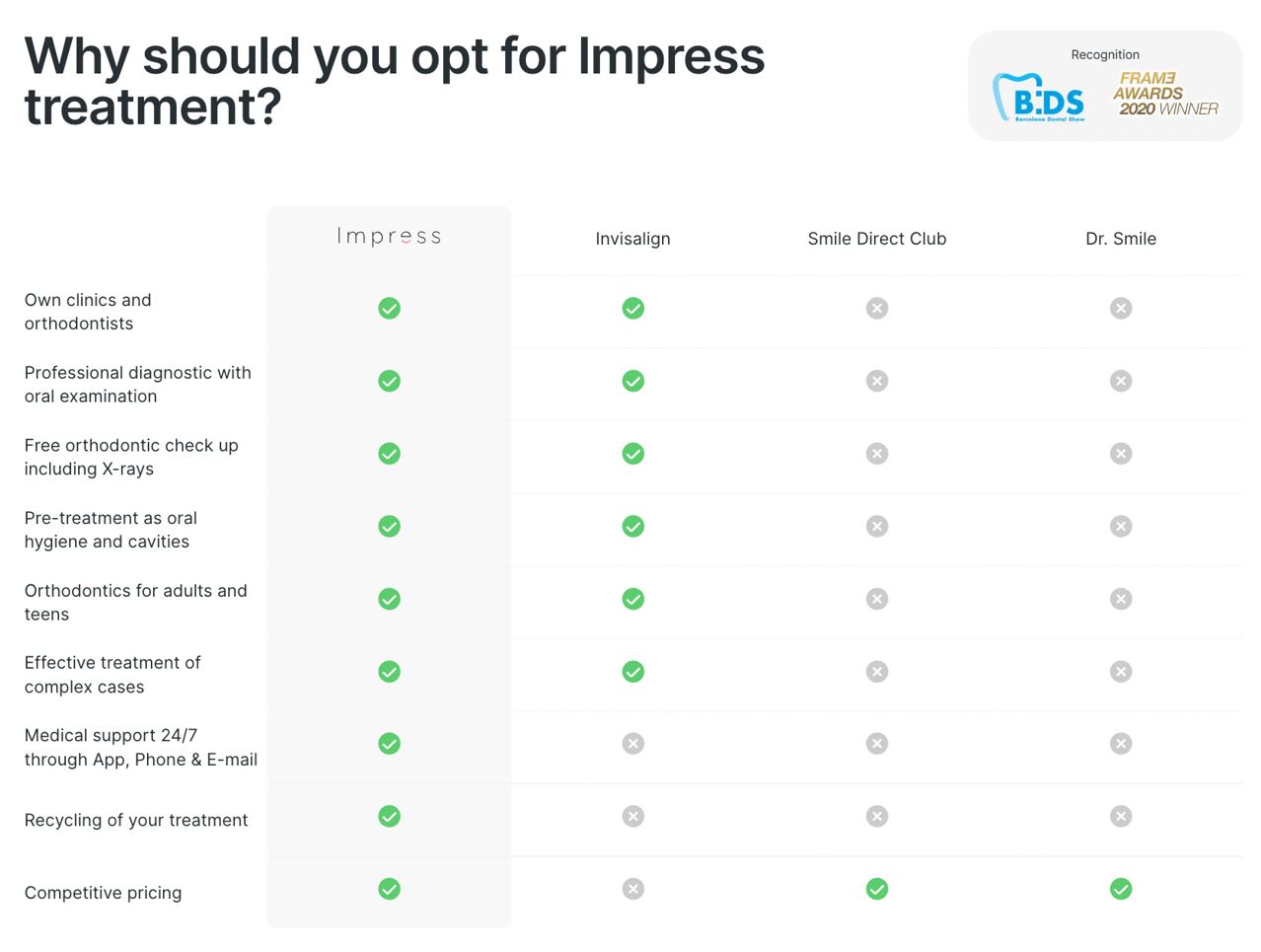 Dopo aver effettuato un confronto tra tutti gli operatori del mercato, solo Impress offre un servizio ortodontico a 360 gradi, non solo con gli allineatori come altre aziende. Tra i servizi che distinguono Impress dai suoi concorrenti, possiamo evidenziare: cliniche proprie, moderne, innovative con attrezzature all’avanguardia e medici altamente qualificati. Puoi avere la garanzia al 100% che il tuo trattamento sia seguito dai migliori medici con oltre 15 anni di esperienza, assistenza 24 ore su 24, 7 giorni su 7 tramite l’app, garanzia di soddisfazione del cliente al 100% e pre-trattamento se necessario (carie, ad esempio).