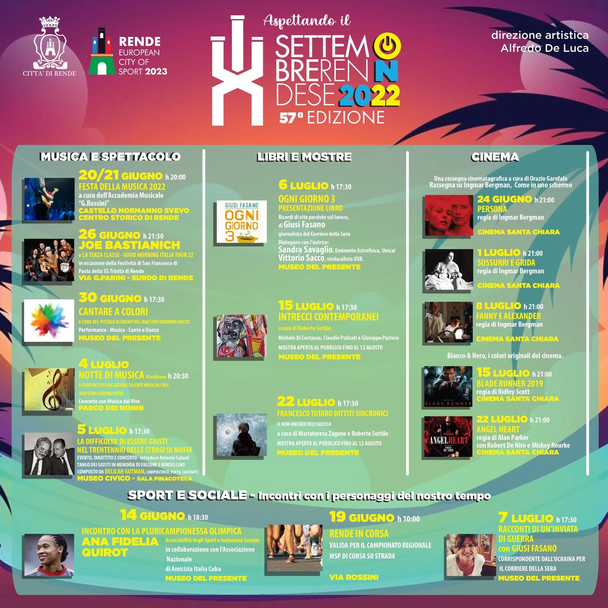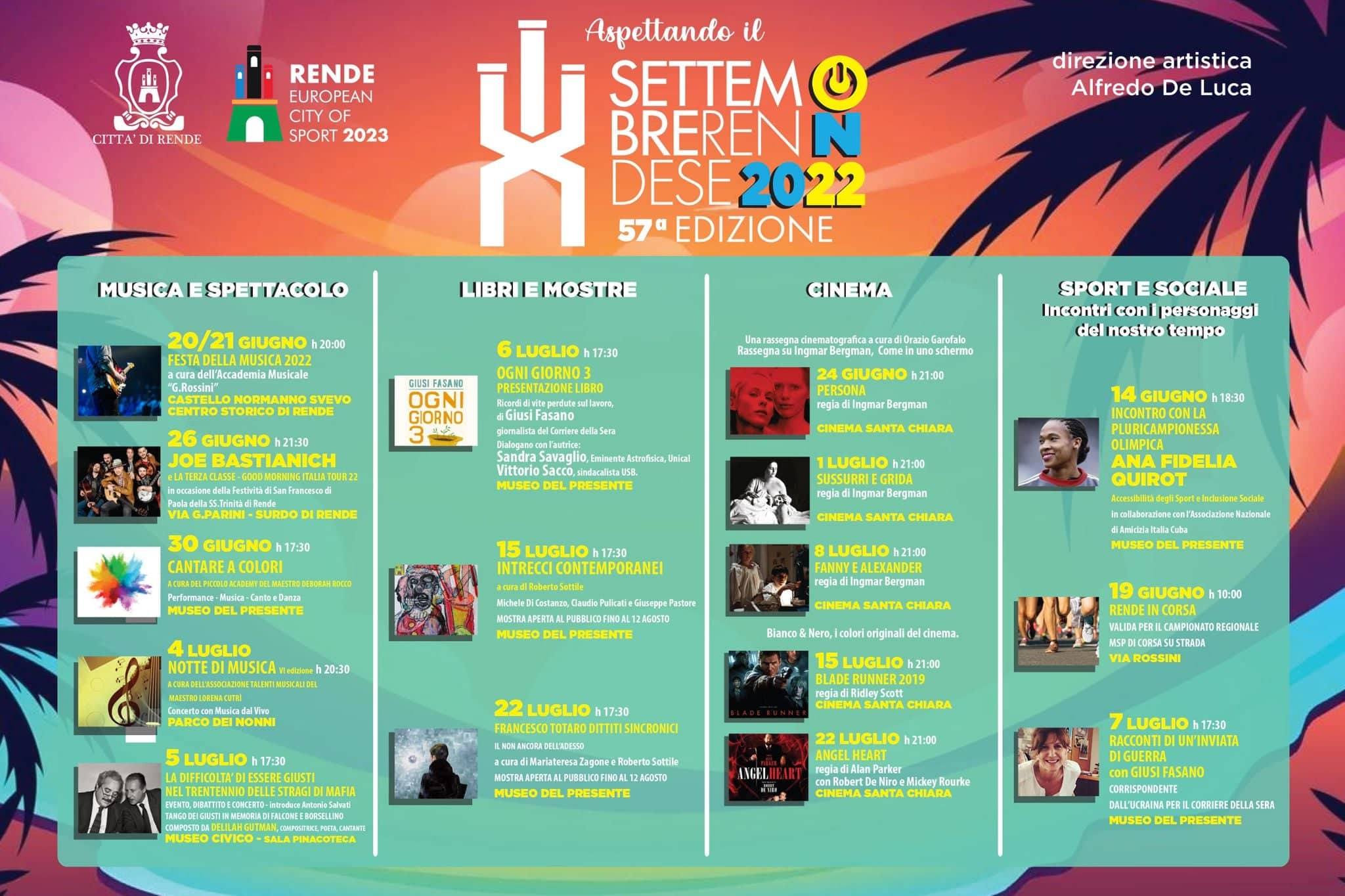 Il Settembre Rendese ON avrà luogo in tutta la città con eventi di rilevanza nazionale ed internazionale e durerà due mesi (Giugno e Luglio) che saranno da preludio al Festival di Settembre.