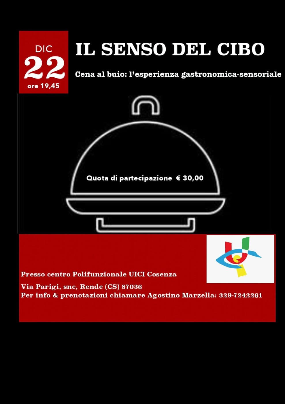 “Il 22 dicembre alle ore 20.00 presso il centro polifunzionale dell’Unione Italiana Ciechi e Ipovedenti sita in Rende, si terrà una serata sensoriale, cena al buio per abbattere gli stereotipi.